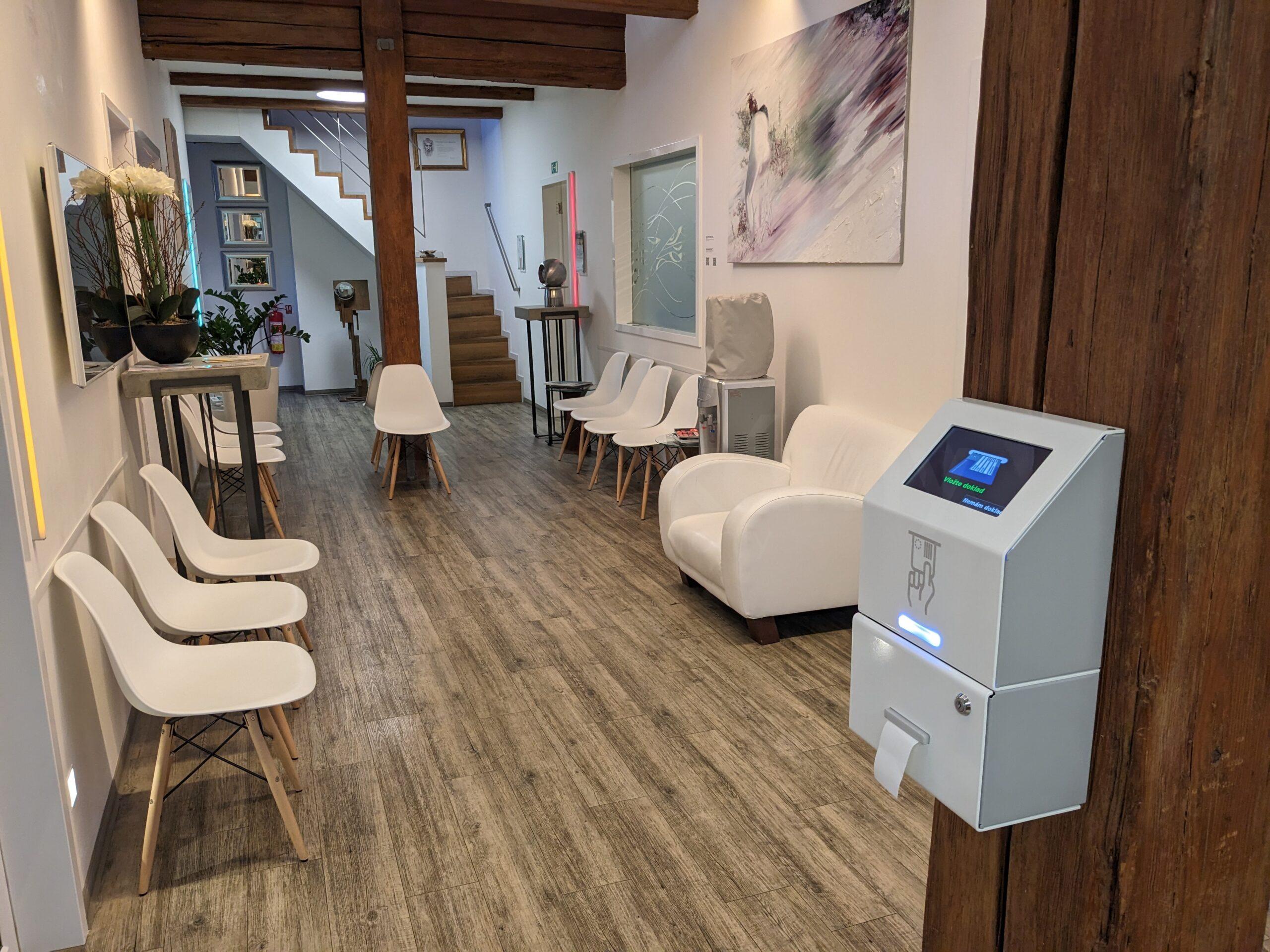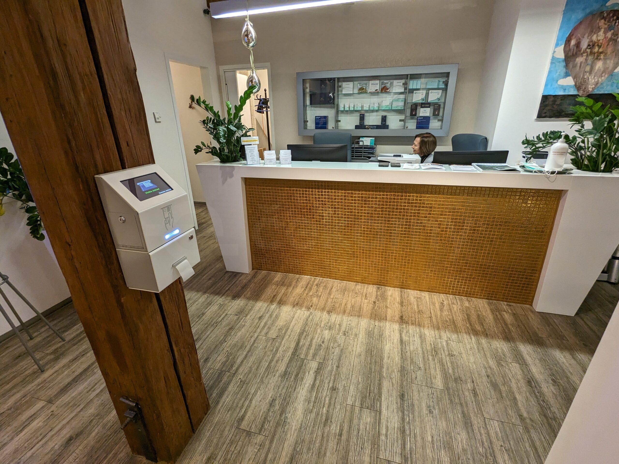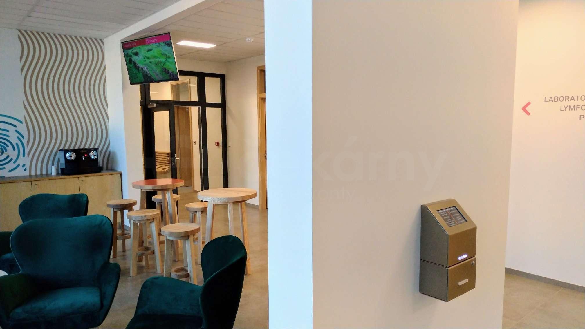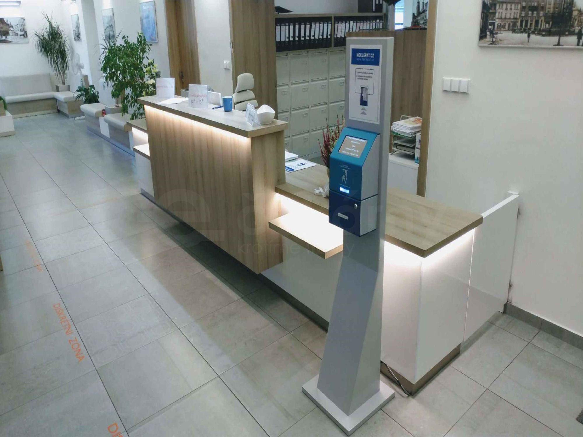 Tento registrační kiosek umožňuje pacientům jednoduchou registraci kartou pojišťovny a poskytuje lékaři přehledný čekárnový systém.